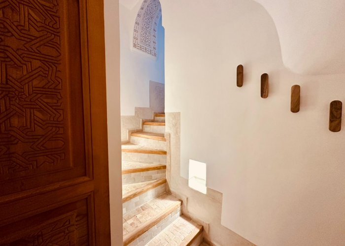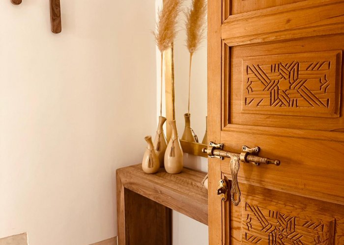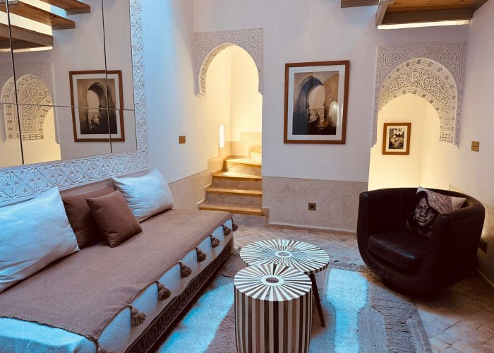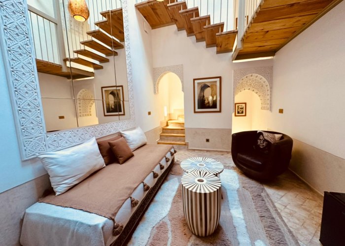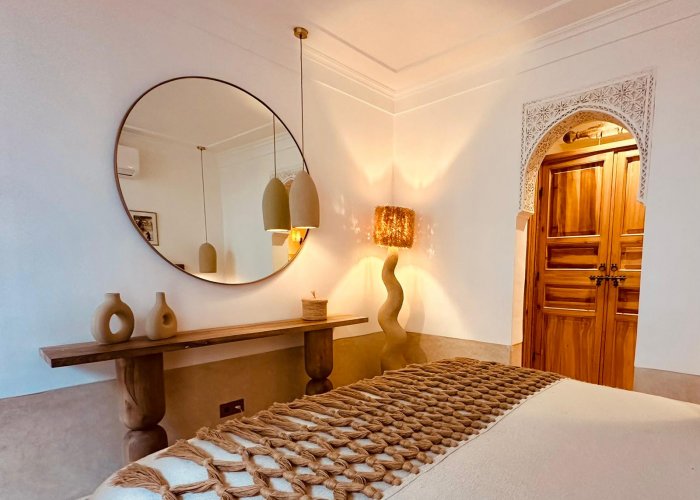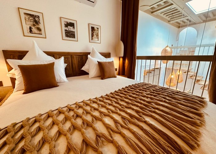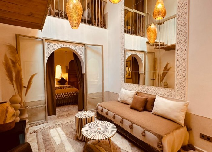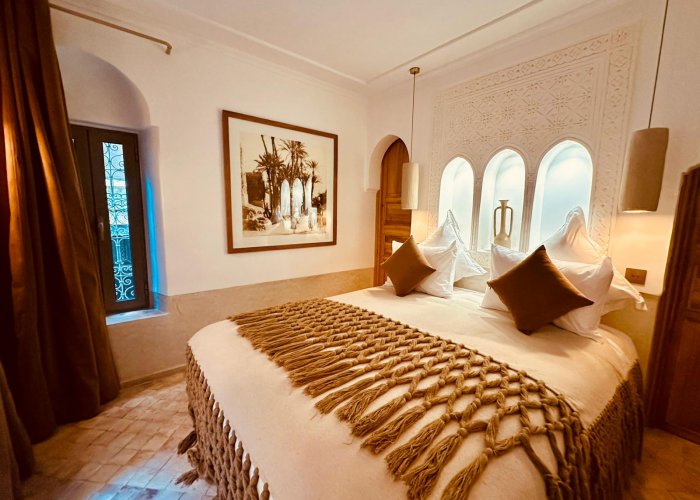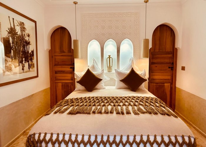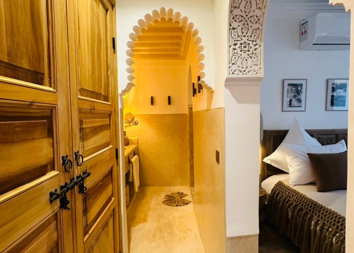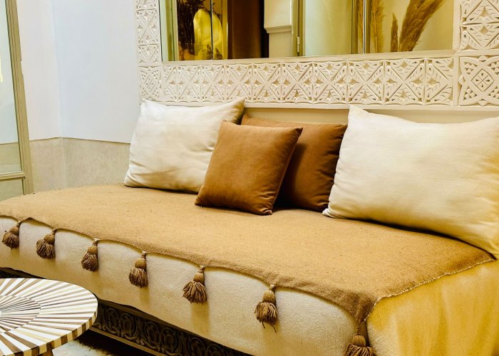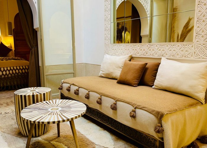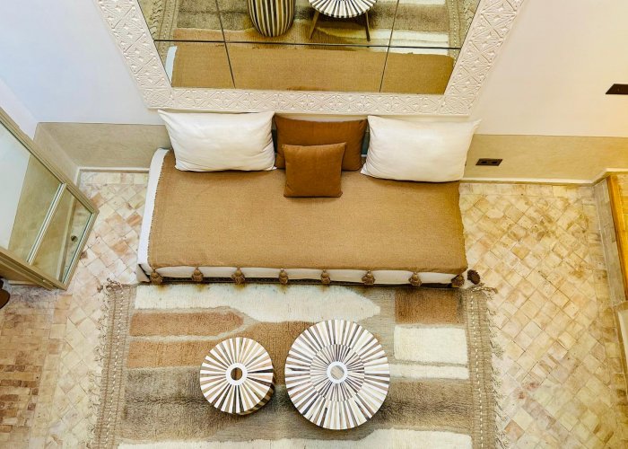 它位于一楼,与 Warda 位于同一平台,可欣赏种植庭院和客厅的景色。您将欣赏马拉喀什的建筑和艺术:传统的 Warka Gaiza 天花板、石膏墙、手工雕刻的床头板和 Taddelakt。这些灯采用锤击和凿刻的铜制成,在麦地那的作坊中制造。地板上的地毯上覆盖着华丽的贝尼乌拉因 (Beni Ouarain) 羊毛地毯。浴室设有十字拱顶、双 Taddelakt 盥洗盆和漂亮的浴缸。