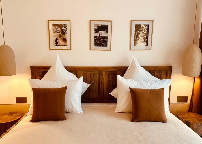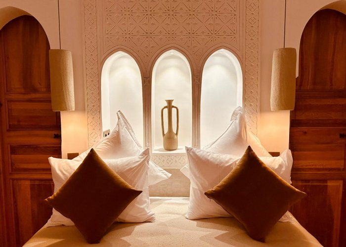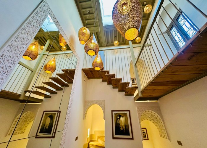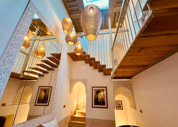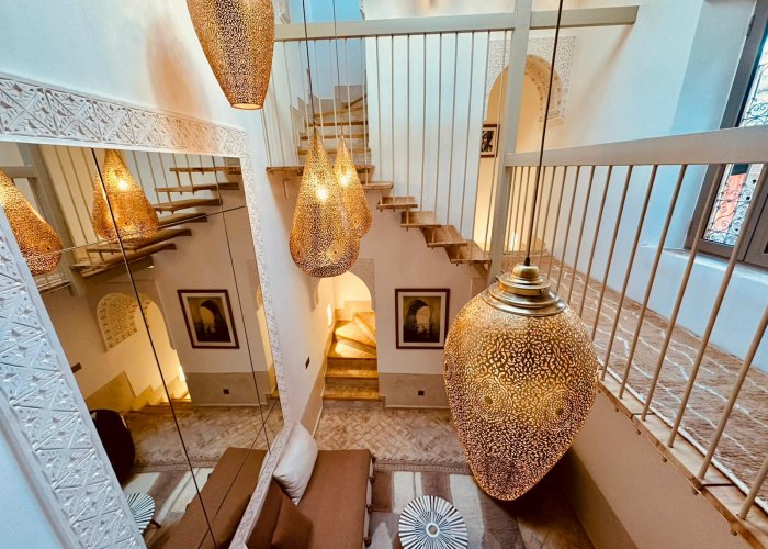 装饰灵感来自东方温暖的氛围,尤其体现在一处宏伟的传统warka gaiza天花板、由铜匠打造的锤打和雕刻铜灯具,以及来自非斯的tadelakt和zellige瓷砖装饰的浴室。