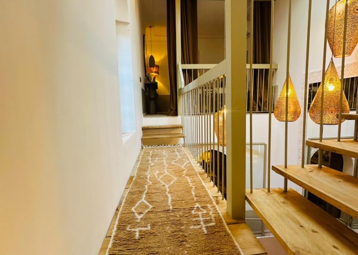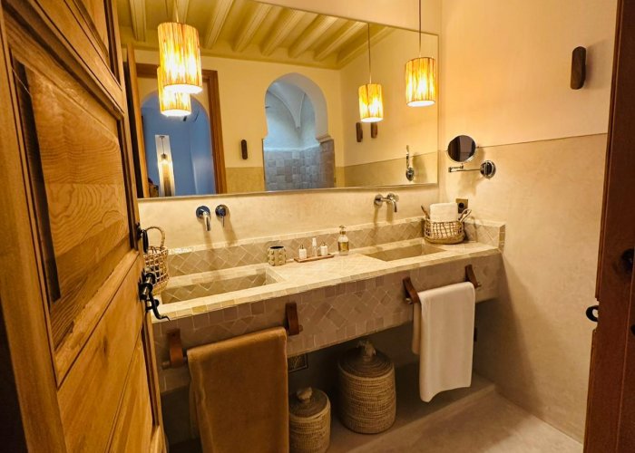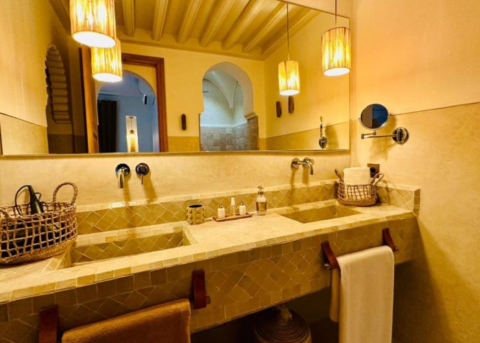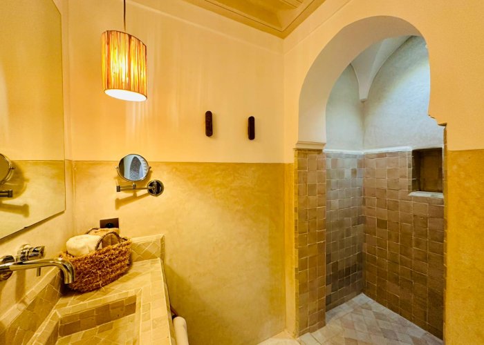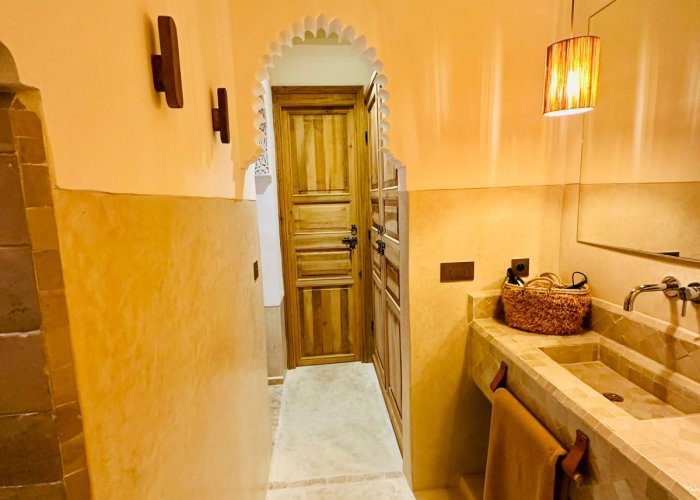 您将欣赏马拉喀什的建筑和艺术:传统的“warka gaiza”天花板、tadelakt、锤打和凿刻的铜灯、“Beni Ouarain”柏柏尔羊毛地毯、露天市场出土的 R'taj 门……东方的魅力仍在延续浴室设有十字拱顶、淋浴间和洗脸盆,采用 tadelakt 材质。