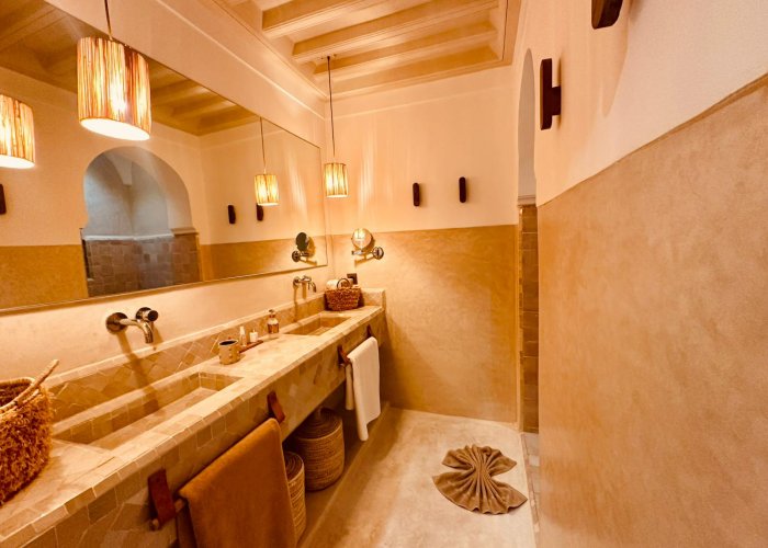 您一定会被某些材料的选择所吸引,例如传统的 Warka gaïza 天花板、Aïn Mama 橱柜以及经过锤击和凿刻的铜灯。完全采用 tadelakt 材质的浴室及其 Warka-gaiza 天花板延续了东方魅力。后者有一个大型步入式淋浴间、一个水槽和一面非常大的镜子。
