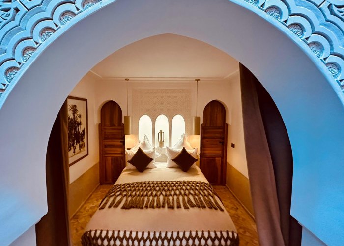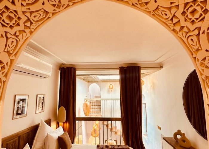 房间的建筑和民族装饰邀请您去旅行:华丽的手工雕刻石膏床头板、jefna 天花板、将卧室与休息区分隔开的美丽拱廊。您一定会喜欢它的 tadelakt 浴室,配有步入式淋浴间和 warka gaiza 天花板。