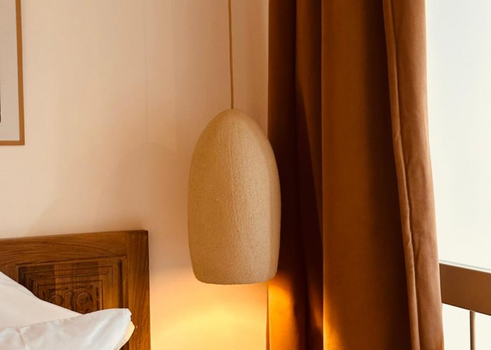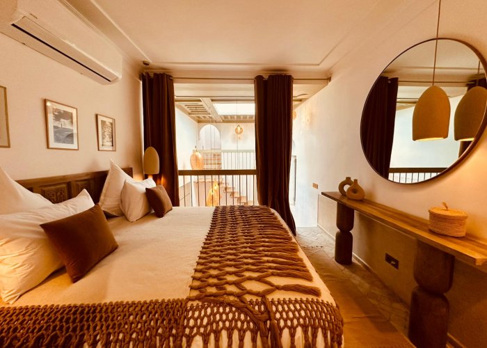 Ambra 套房位于一楼,通过大型拱廊通向露台,光线非常美丽。由于其表面积,它提供了空间和舒适感(35 平方米+ 15 平方米的私人露台),并设有 2 个休息区,一个位于套房内,另一个位于露台上。它通过民族和别致的装饰完美地体现了琥珀温暖而神秘的气息:瓦尔卡盖扎的宏伟传统天花板,锤打和凿刻的铜制成的精致照明装置,天然织物,如优雅的毯子和柏柏尔地毯......全部采用 tadelakt 的浴室及其宏伟的十字拱形天花板延续了东方的魅力。